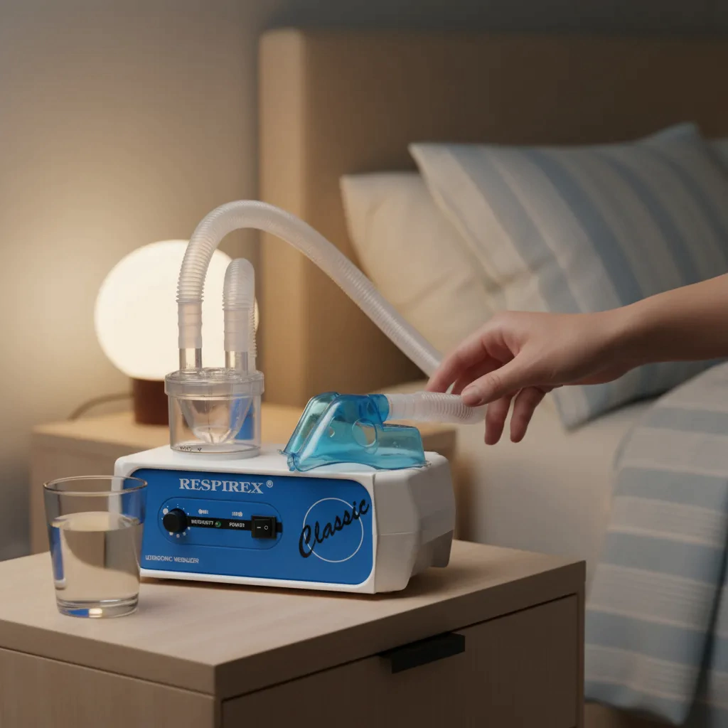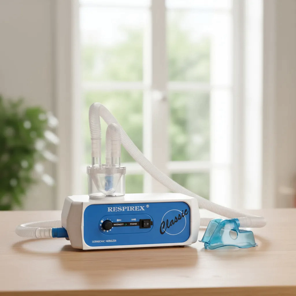 Nebulizador ultrasónico que genera partículas finas entre 3 y 8 micrones, ideal para afecciones respiratorias en adultos y niños.