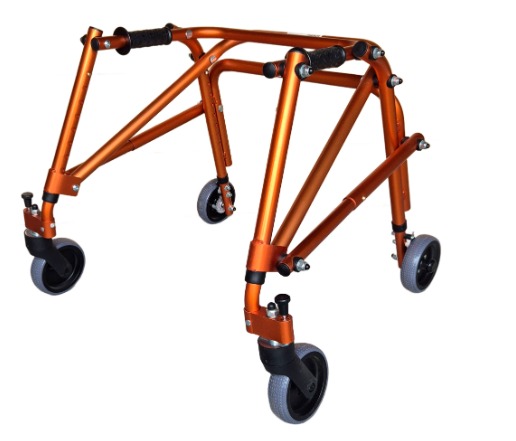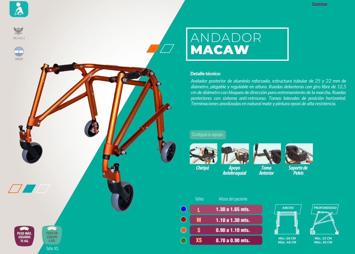 Andador posterior de aluminio reforzado, estructura tubular de 25 y 22 mm de diámetro, plegable y regulable en altura. Ruedas delanteras con giro libre de 12,5 cm de diámetro con bloqueo de dirección para entrenamiento de la marcha. Ruedas posteriores con sistema anti-retroceso. Tomas laterales de posición horizontal. Terminaciones anodizadas en natural mate y pintura epoxi de alta resistencia.