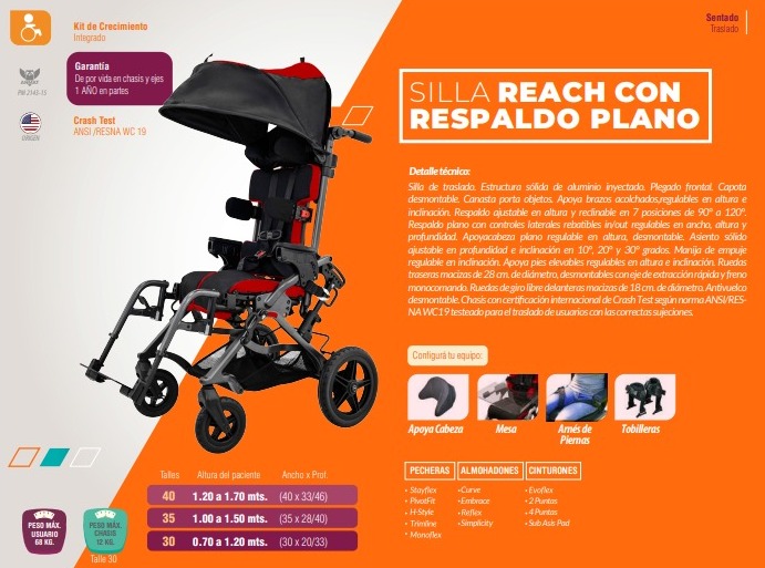 Silla de traslado. Estructura sólida de aluminio inyectado. Plegado frontal. Capota desmontable. Canasta porta objetos. Apoya brazos acolchados,regulables en altura e inclinación. Respaldo ajustable en altura y reclinable en 7 posiciones de 90° a 120°. Respaldo plano con controles laterales rebatibles in/out regulables en ancho, altura y profundidad. Apoyacabeza plano regulable en altura, desmontable. Asiento sólido ajustable en profundidad e inclinación en 10°, 20° y 30° grados. Manija de empuje regulable en inclinación. Apoya pies elevables regulables en altura e inclinación. Ruedas traseras macizas de 28 cm. de diámetro, desmontables con eje de extracción rápida y freno monocomando. Ruedas de giro libre delanteras macizas de 18 cm. de diámetro. Antivuelco desmontable. Chasis con certificación internacional de Crash Test según norma ANSI/RESNA WC19 testeado para el traslado de usuarios con las correctas sujeciones.