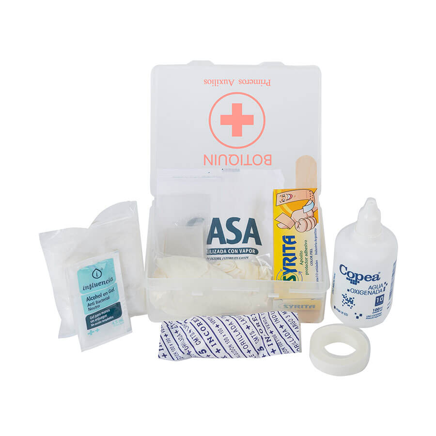 Incluye insumos básicos para limpieza, protección y vendaje.