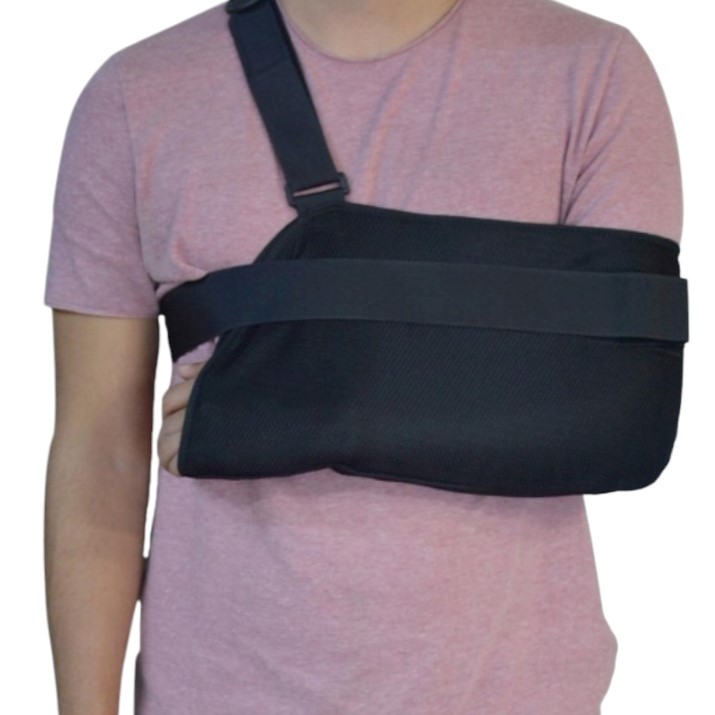 Soporte de brazo confeccionado en tela resistente con correa cruzada y banda adicional de inmovilización, diseñado para brindar estabilidad y soporte firme ante lesiones.