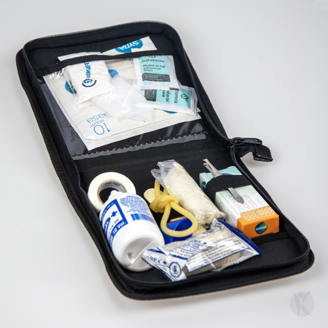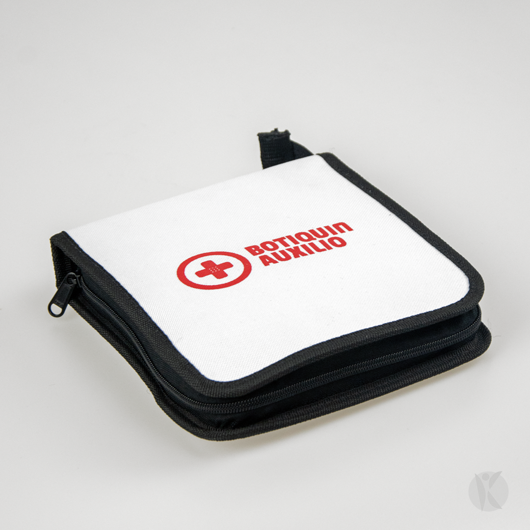 Cartuchera de primeros auxilios en tela de cordura reforzada, liviana y muy completa, ideal para aire libre, merchandising y uso en autos.