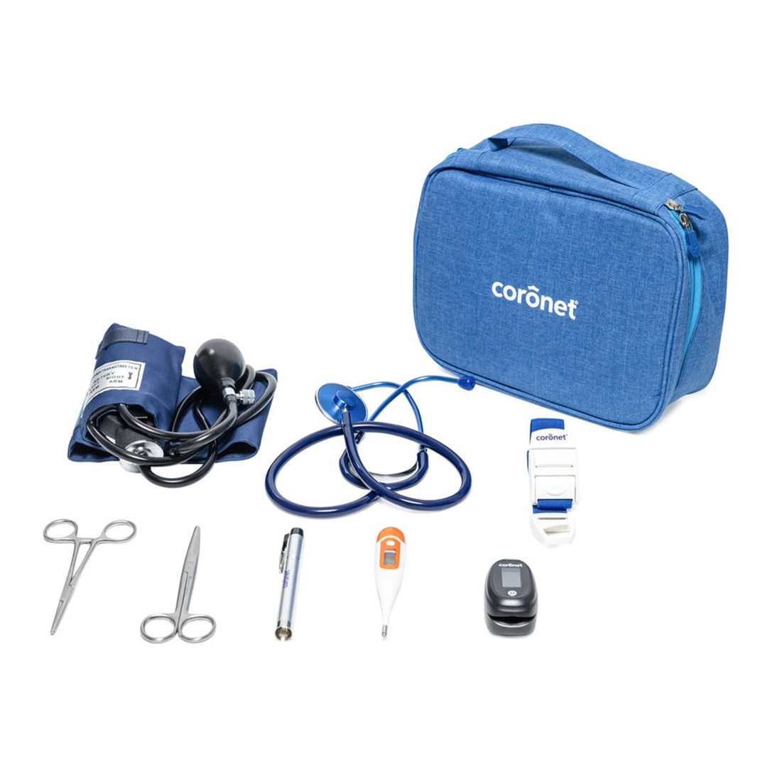 Contiene tensiómetro, estetoscopio, oxímetro, termómetro, linterna, torniquete y pinzas/tijeras