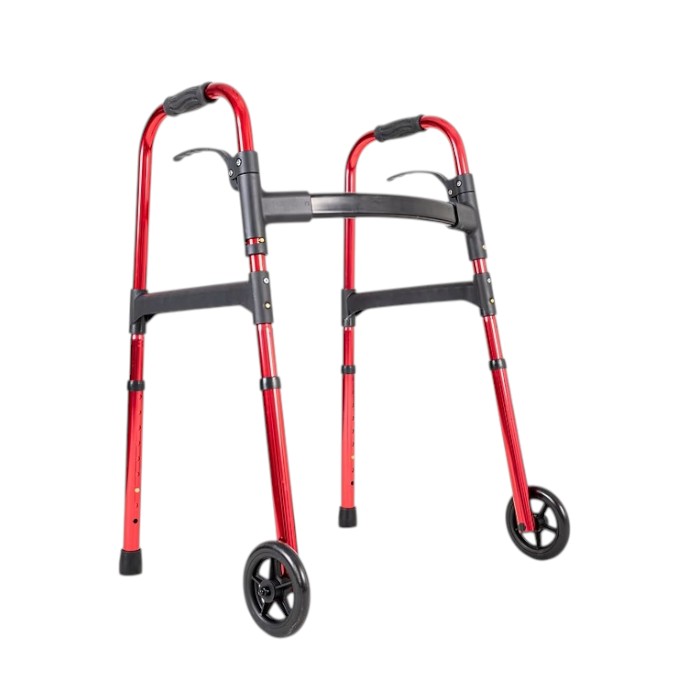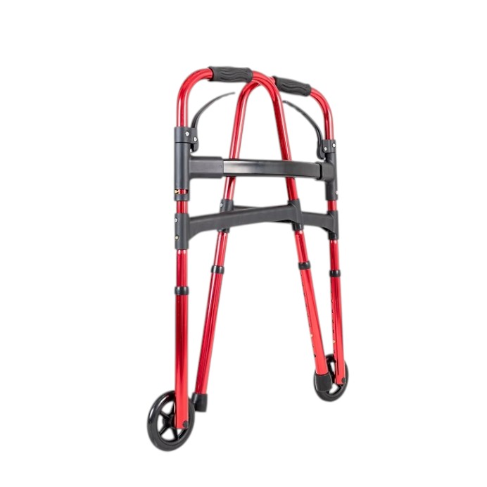 Andador plegable y compacto de aluminio reforzado, con ruedas y regatones antideslizantes, diseñado para movilidad segura y cómoda.
