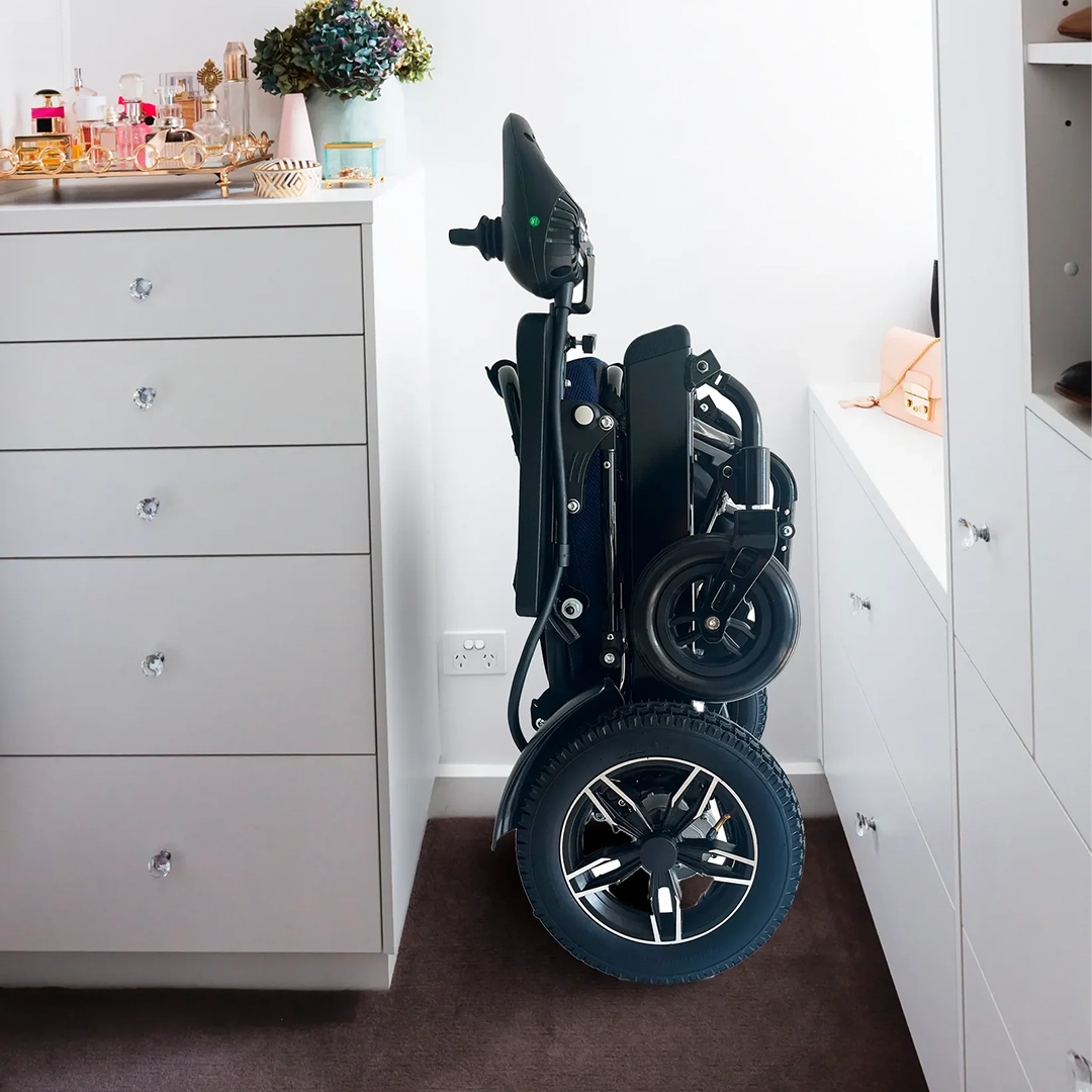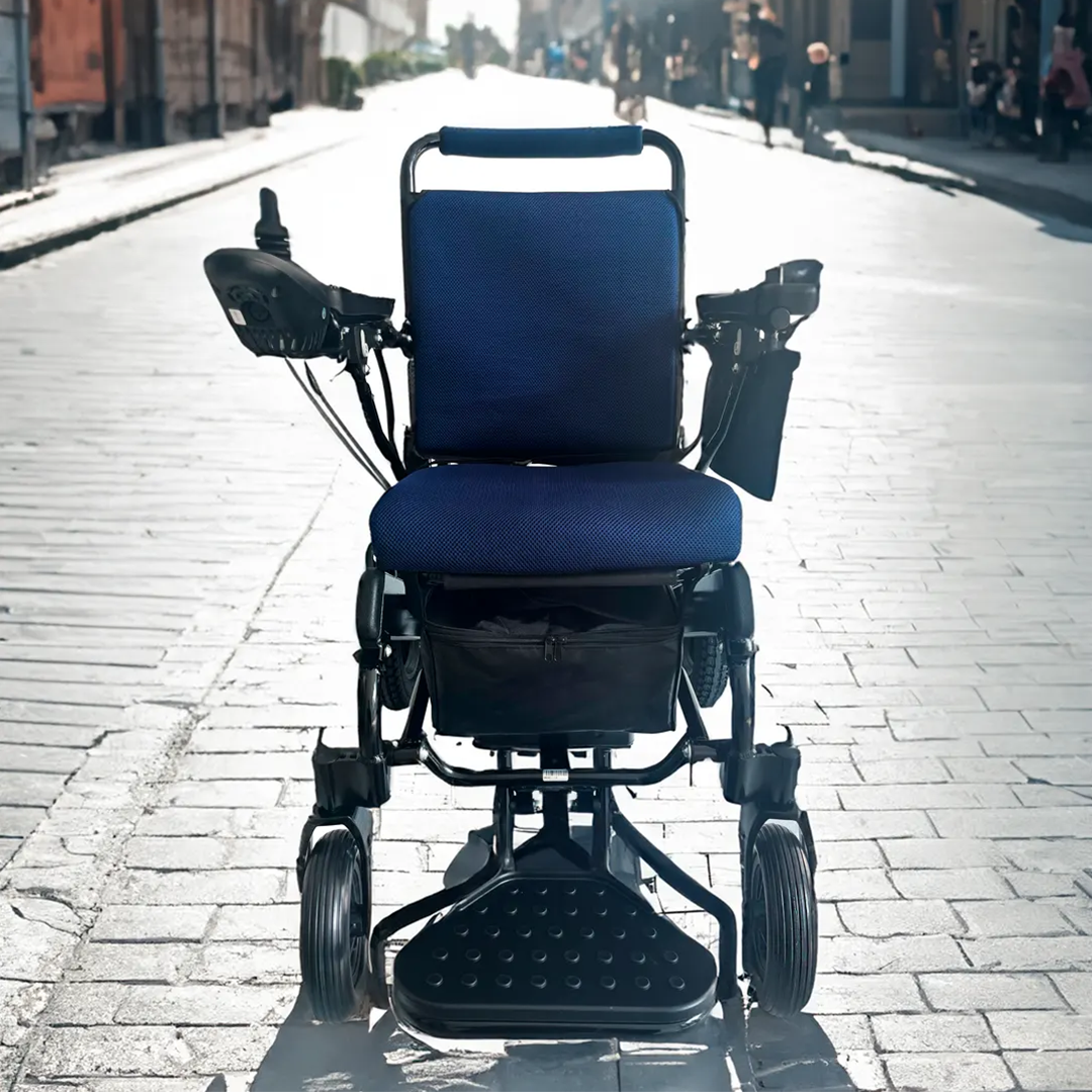Silla de ruedas eléctrica plegable con diseño ergonómico, pensada para recorrer largas distancias con estabilidad, seguridad y facilidad de transporte.