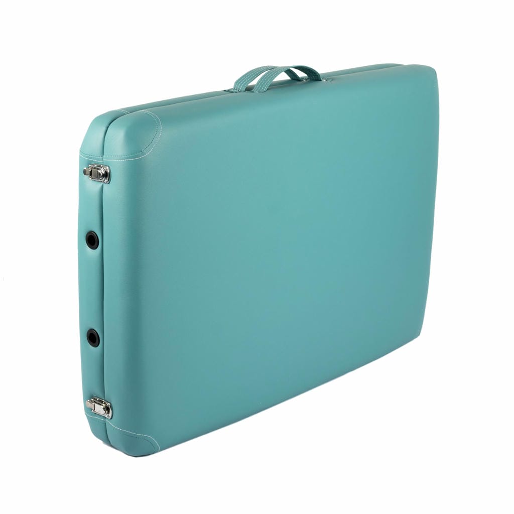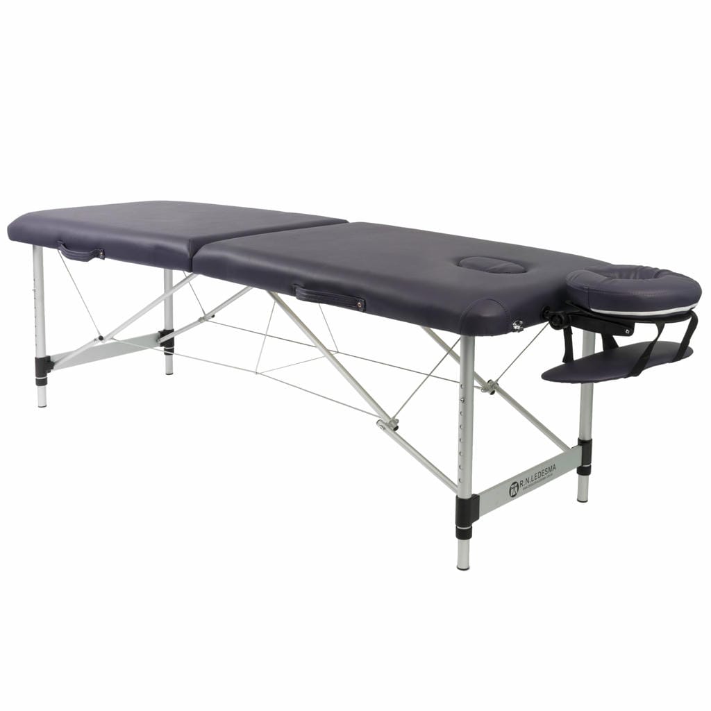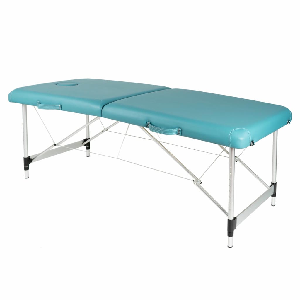 Camilla plegable de aluminio con tapizado de cuerina lavable, patas regulables, apoyacabeza desmontable y bolso transportador.