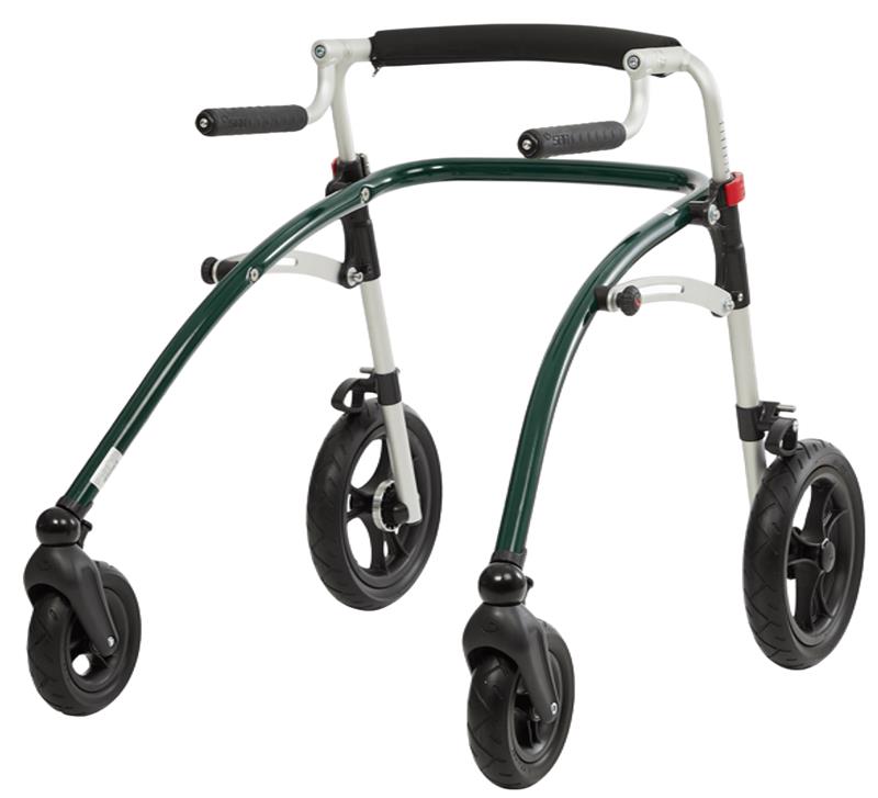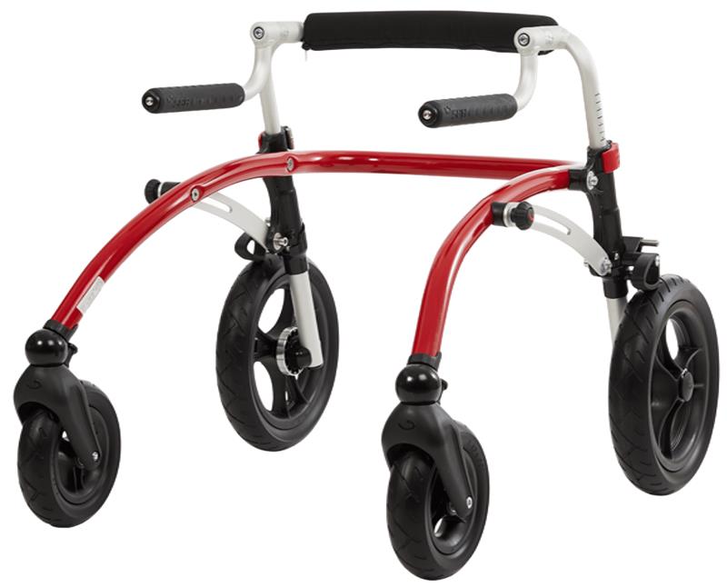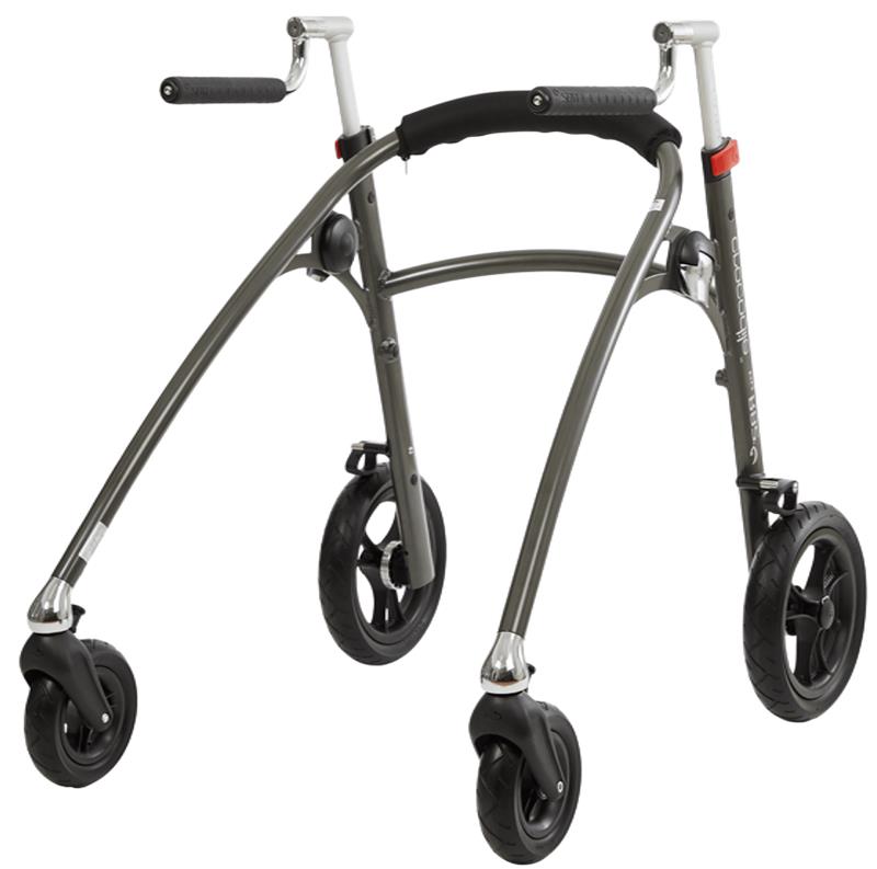 Andador de uso posterior Crocodile con estructura de aluminio ultraliviano. Marco plegable y ajustable en altura para acompañar el crecimiento del paciente. Empuñaduras independientes multi ajustables en ancho y altura. Ruedas delanteras de 20 cm de diámetro, sólidas giratorias con estabilizador de dirección para entrenamiento de la marcha. Ruedas traseras de 30 cm de diámetro, sólidas ajustables con y anti-retroceso. Su diseño con ruedas agrandadas lo hace ideal para su uso en exteriores y superficies irregulares, fomentando el juego, la exploración y la participación activa.