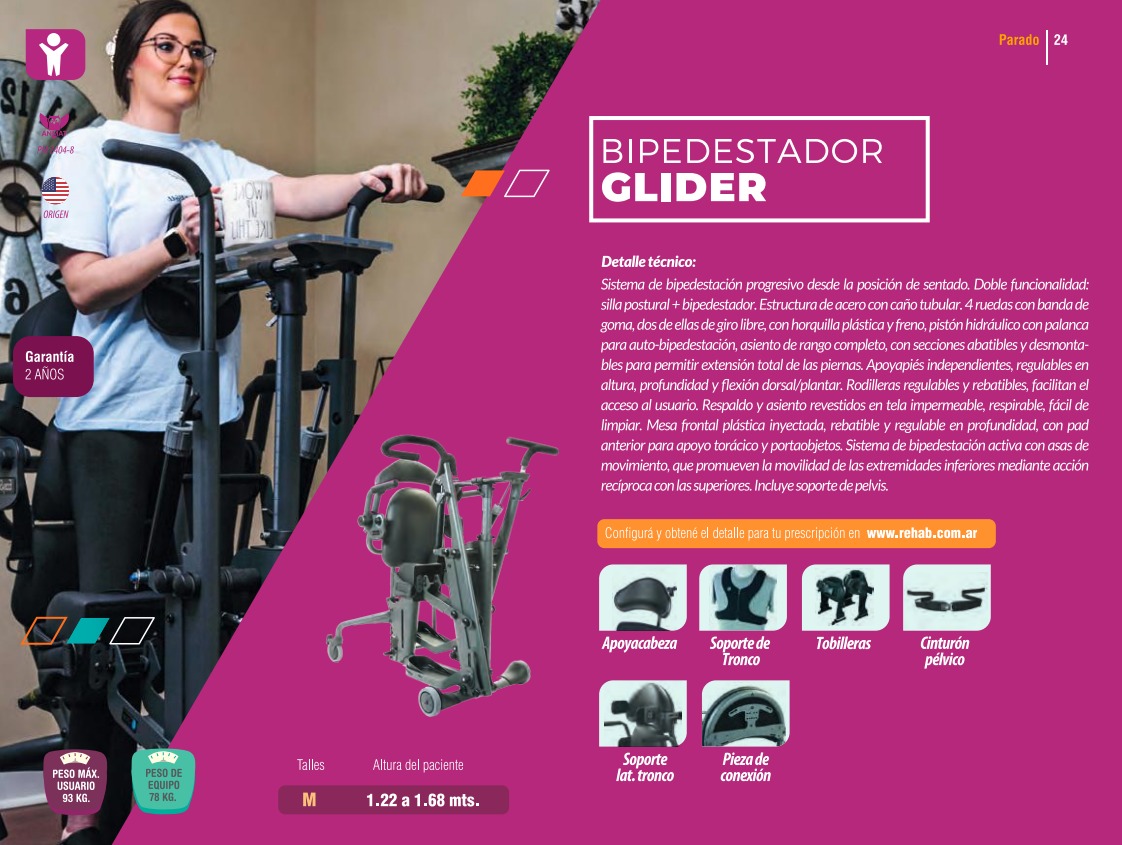 Sistema de bipedestación progresivo desde la posición de sentado. Doble funcionalidad: silla postural + bipedestador. Estructura de acero con caño tubular. 4 ruedas con banda de goma, dos de ellas de giro libre, con horquilla plástica y freno, Pistón hidráulico con palanca para auto-bipedestación Asiento de rango completo, con secciones abatibles y desmontables para permitir extensión total de las piernas. Apoyapiés independientes, regulables en altura, profundidad y flexión dorsal/plantar. Rodilleras regulables y rebatibles, facilitan el acceso al usuario Respaldo y asiento revestidos en tela impermeable, respirable, fácil de limpiar. Mesa frontal plástica inyectada, rebatible y regulable en profundidad, con pad anterior para apoyo torácico y portaobjetos. Sistema de bipedestación activa con asas de movimiento, que promueven la movilidad de las extremidades inferiores mediante acción recíproca con las superiores. Incluye soporte de pelvis.