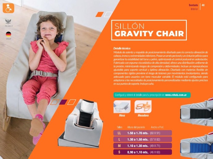 Módulo de asiento y respaldo de posicionamiento diseñado para la correcta alineación de cabeza, tronco y extremidades inferiores. Posee un arnés pectoral y un cinturón pélvico para garantizar la estabilidad del torso y pelvis, optimizando el control postural en sedestación. Fabricado con espuma viscoelástica de alta densidad, ofrece una distribución uniforme de la presión, minimizando riesgos de compresión y deformidades. Incluye un reposacabezas ajustable para soporte cervical y óptima alineación. Diseñado con materias flexible sin componentes rígidos previene el riesgo de lesiones por movimientos involuntarios, siendo adecuado para usuarios con tono muscular variable. El módulo está configurado para adaptarse a las necesidades de posicionamiento personalizadas mediante ajustes precisos en sus puntos de soporte. Incluye cuña y mesa.