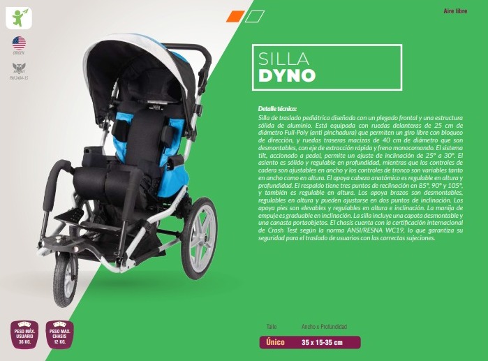 Silla de traslado pediátrica diseñada con un plegado frontal y una estructura sólida de aluminio. Está equipada con ruedas delanteras de 25 cm de diámetro Full-Poly (anti pinchadura) que permiten un giro libre con bloqueo de dirección, y ruedas traseras macizas de 40 cm de diámetro que son desmontables, con eje de extracción rápida y freno monocomando. El sistema tilt, accionado a pedal, permite un ajuste de inclinación de 25° a 30°. El asiento es sólido y regulable en profundidad, mientras que los controles de cadera son ajustables en ancho y los controles de tronco son variables tanto en ancho como en altura. El apoya cabeza anatómico es regulable en altura y profundidad. El respaldo tiene tres puntos de reclinación en 85°, 90° y 105°, y también es regulable en altura. Los apoya brazos son desmontables, regulables en altura y pueden ajustarse en dos puntos de inclinación. Los apoya pies son elevables y regulables en altura e inclinación. La manija de empuje es graduable en inclinación. La silla incluye una capota desmontable y una canasta portaobjetos. El chasis cuenta con la certificación internacional de Crash Test según la norma ANSI/RESNA WC19, lo que garantiza su seguridad para el traslado de usuarios con las correctas sujeciones.