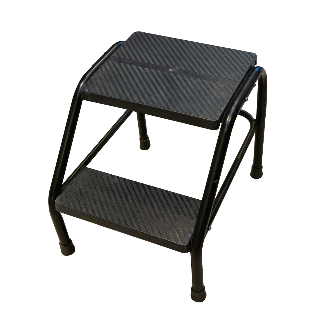 Estructura de dos escalones con estructura de acero esmaltado y superficie antideslizante, resistente y seguro.