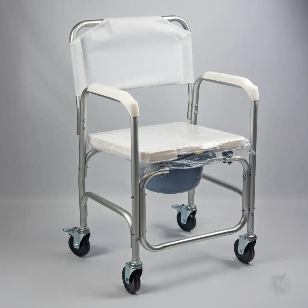 Inodoro de aluminio con ruedas para ducha, resistente al agua, con asiento rebatible, respaldo desmontable y bacinilla, diseñado para facilitar la higiene y el traslado del usuario.