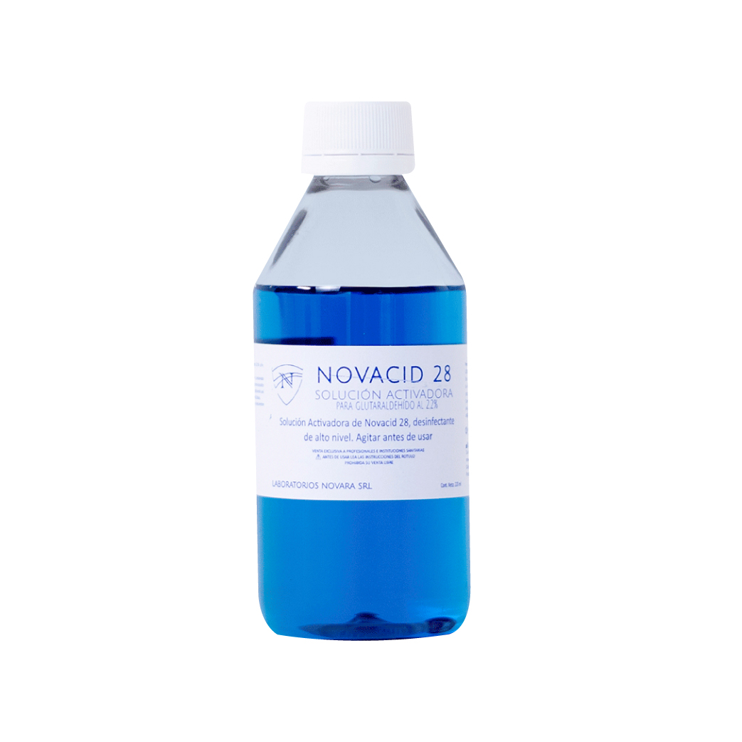 Antes de usar la solución de Novacid 28, la misma debe ser activada. Registre la fecha de activación. Se debe verter el contenido de la solución activadora a la botella o al bidón (según corresponda) de NOVACID 28. Mezclar muy bien. No diluir. La solución tomará una leve coloración azul, indicando así que está lista para ser utilizada. El producto así preparado tiene una estabilidad de 28 días, siempre y cuando se controle la concentración mínima inhibitoria, que es de 1.0%, la cual se determinará mediante el uso de las tiras reactivas de control para la solución de Novacid 28.