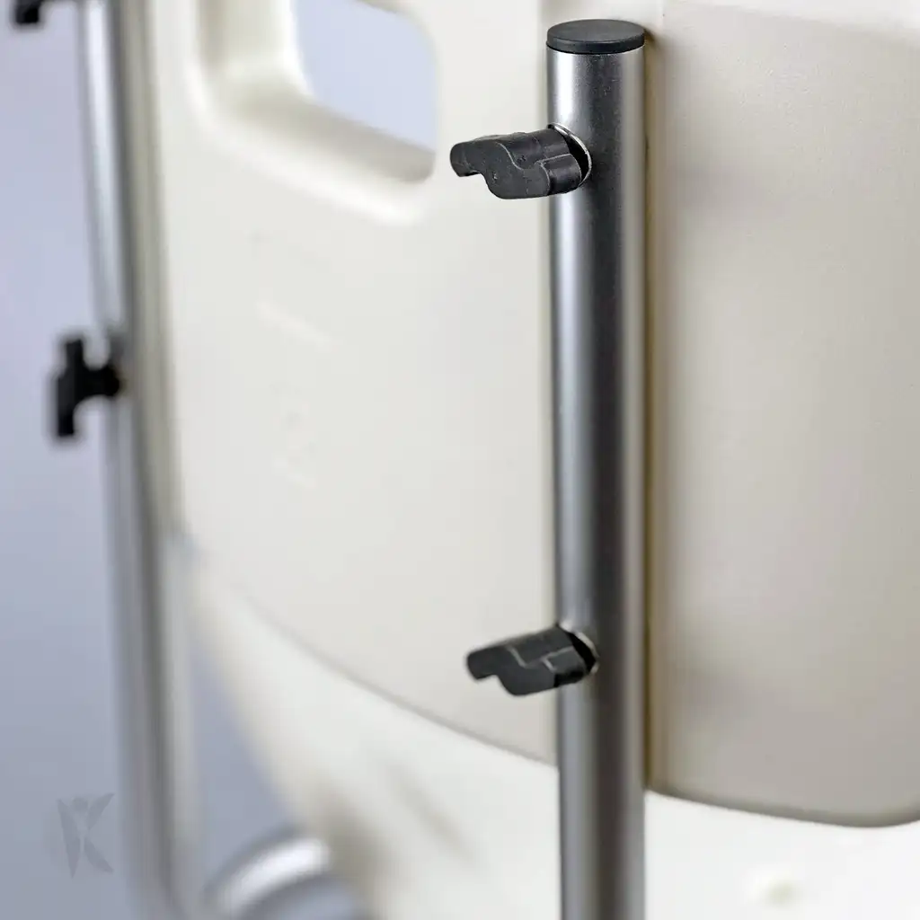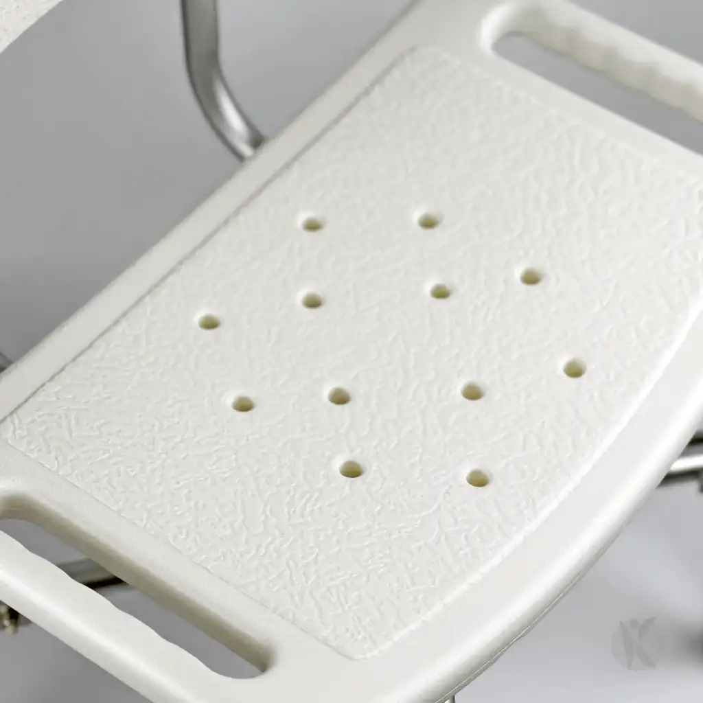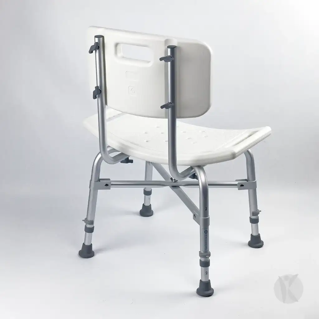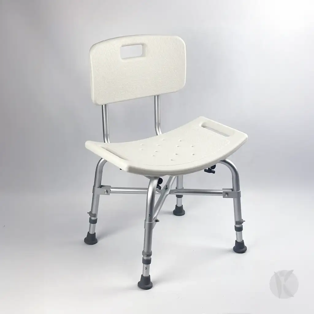 Silla de ducha de aluminio reforzado, con asiento y respaldo ergonómicos, diseñada para brindar seguridad y comodidad durante la higiene personal.