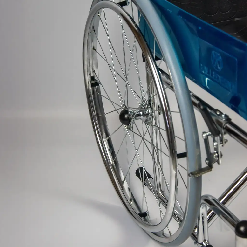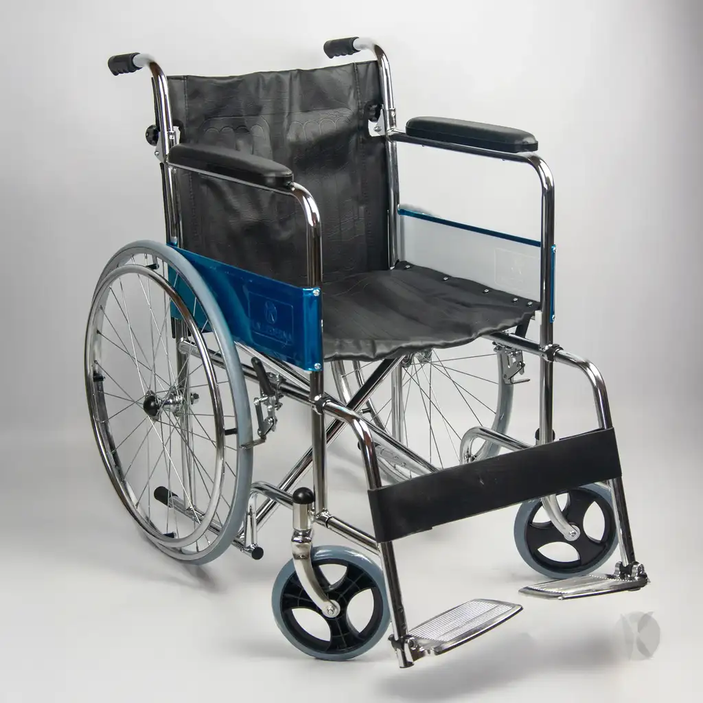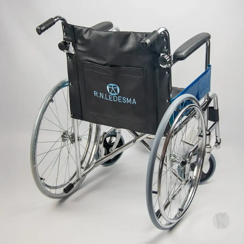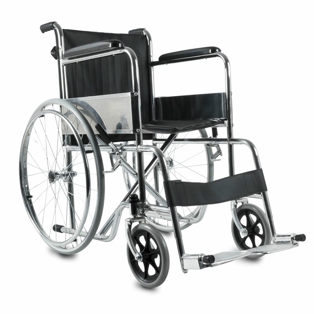 Silla de ruedas fija y plegable, con respaldo rebatible y estructura de acero cromado, diseñada para uso diario y fácil transporte.