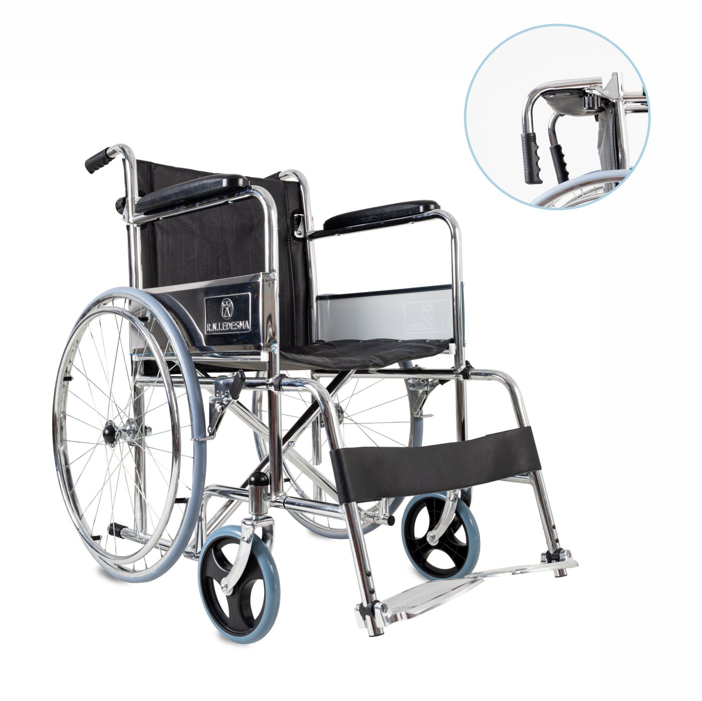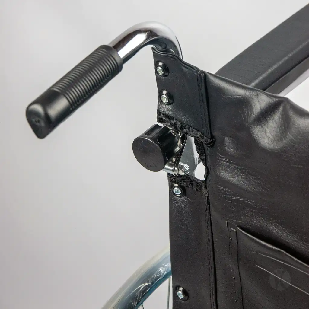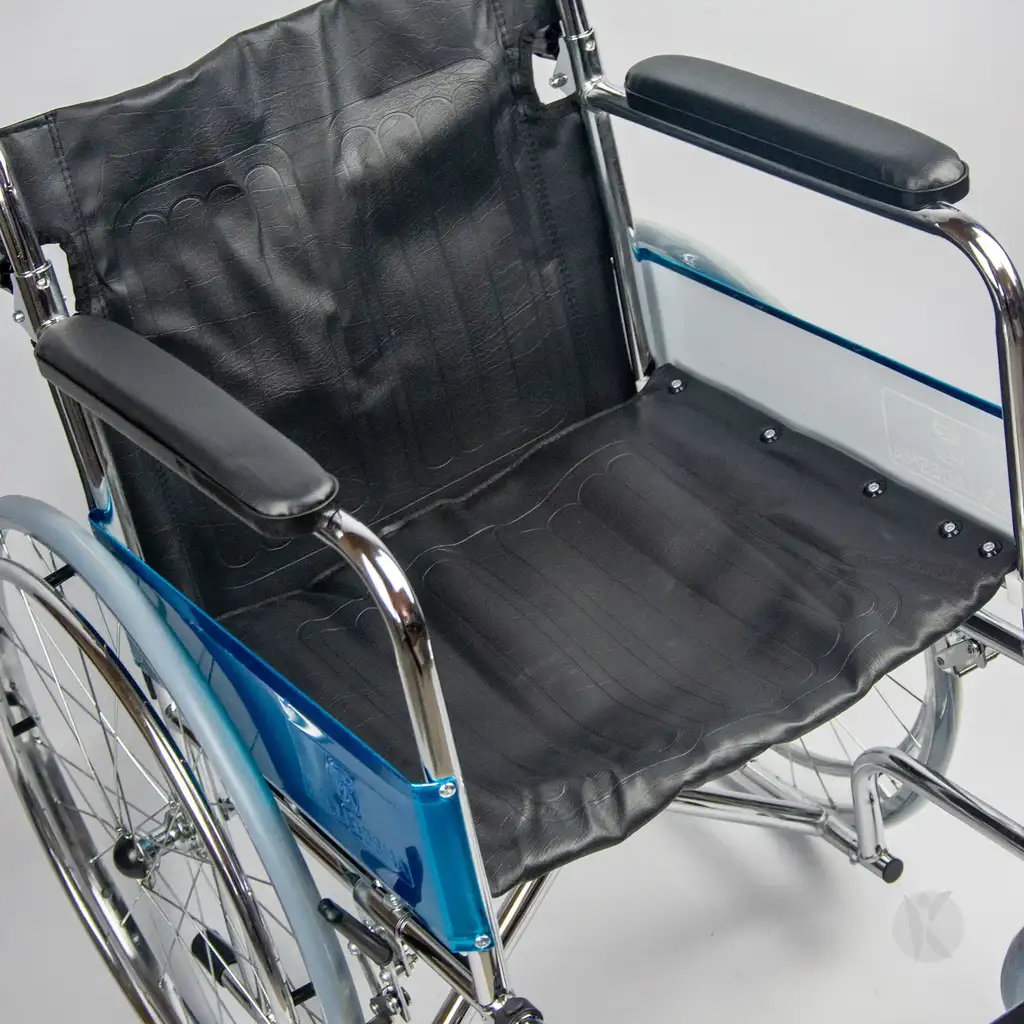 Silla de ruedas fija y plegable, con respaldo rebatible y estructura de acero cromado, diseñada para uso diario y fácil transporte.