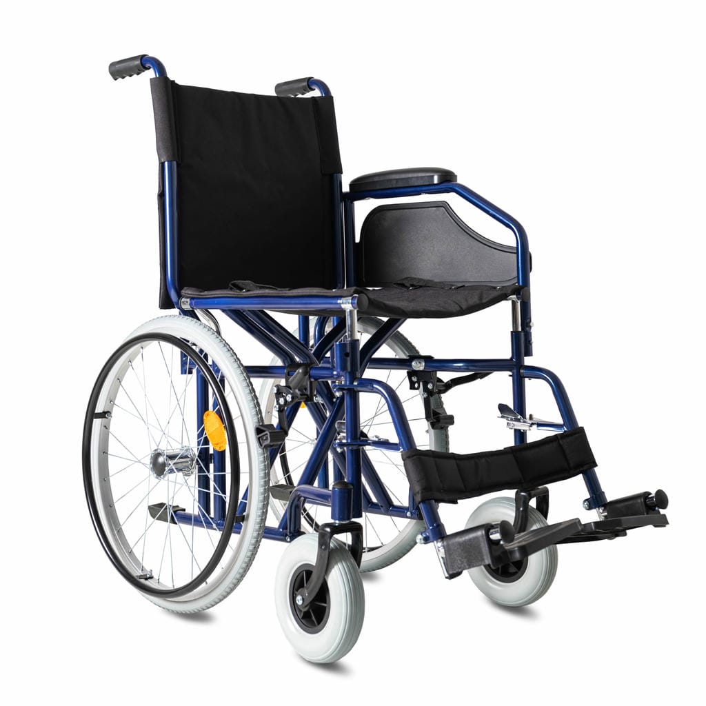 Silla de ruedas plegable de acero con doble cruceta, diseñada para uso diario, con estructura resistente y componentes desmontables que facilitan el traslado y manejo.