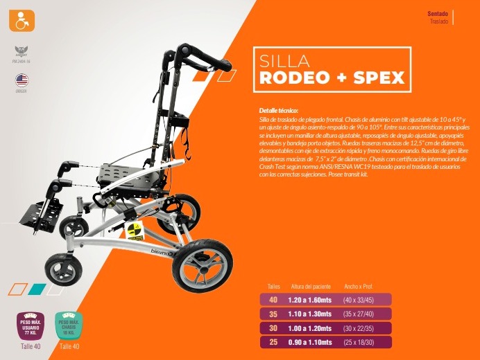 Silla de traslado de plegado frontal. Chasis de aluminio con tilt ajustable de 10 a 45º y un ajuste de ángulo asiento-respaldo de 90 a 105º. Entre sus características principales se incluyen un manillar de altura ajustable, reposapiés de ángulo ajustable, apoyapiés elevables y bandeja porta objetos. Ruedas traseras macizas de 12,5” cm de diámetro, desmontables con eje de extracción rápida y freno monocomando. Ruedas de giro libre delanteras macizas de 7,5” x 2” de diámetro .Chasis con certificación internacional de Crash Test según norma ANSI/RESNA WC19 testeado para el traslado de usuarios con las correctas sujeciones. Posee transit kit.