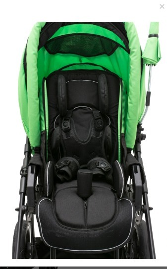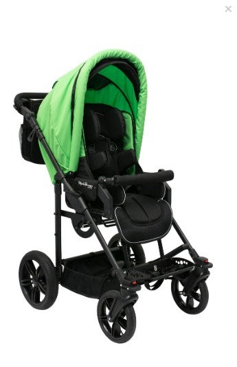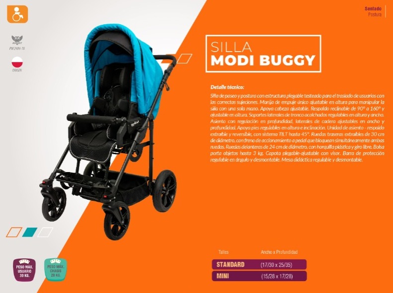 Silla de traslado y postura. Chasis de aluminio plegable con amortiguadores. Ruedas delanteras giro libre y extraíbles. Ruedas traseras desmontables con freno a pedal. Butaca regulable en ancho y profundidad de asiento y altura del respaldo para acompañar el crecimiento, giratoria, reversible y desmontable. Asiento, respaldo y apoya pies con inclinación ajustable. Soportes laterales de cabeza, tronco y cadera con ajuste y regulación independiente. Manillar regulable en diferentes posiciones. Bolsa porta objetos, cobertor de lluvia, mesa, capota y barra de protección.