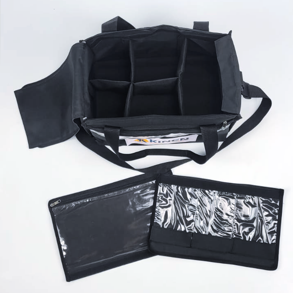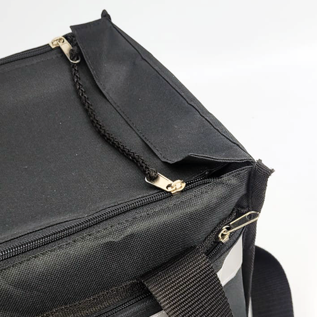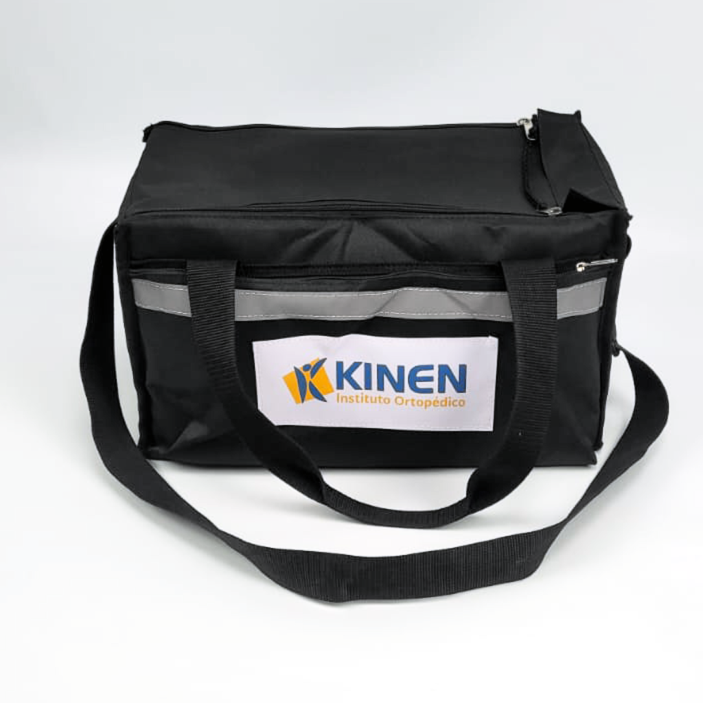 Bolso de emergencias de tela cordura importada con estructura acolchada, divisiones removibles y bolsillos internos y externos para organización.